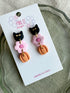 Black cats, pumpkins, and flowers—oh my! These black cat Halloween earrings bring all the magic of fall in one playful design. Lightweight and handmade with polymer clay, they’re the purr-fect spooky cute earrings for any cat lover.